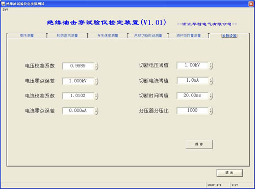 一、装置的用途 该装置用于检测“绝缘油击穿电压测试仪”的主要电气参数,能根据《JJG(浙)86-2006绝缘油击穿电压测试仪检定规程》对“绝缘油击穿电压测试仪”的输出电压及输出电压的频率、失真度、升压速度进行检定,还可以对“绝缘油击穿电压测试仪”击穿切断时间进行检测。 二、装置功能 本装置的主要功能有: 2.1 高压测量 2.2 高压频率测量 2.3 高压失真度测量 2.4 升压速率测量 2.5 高压切断时间分析 2.6 高压侧短路电流测量 2.7 油杯电容量测量 三、主要技术参数 3.1 电压测量: 测量范围:5kV-100kV 测量准确度:±(0.5%×读数+2个字) 3.2 频率测量: 范围:30-100Hz 分辨率0.01Hz 测量精度:±0.1% 3.3 输出电压失真度测量: 输入电压范围:5kV-100kV 精度:±0.5dB 3.4 高压侧短路电流测量: 测量范围:0.1mA-10mA 分辨率:0.01mA 精度:±0.5%+3字